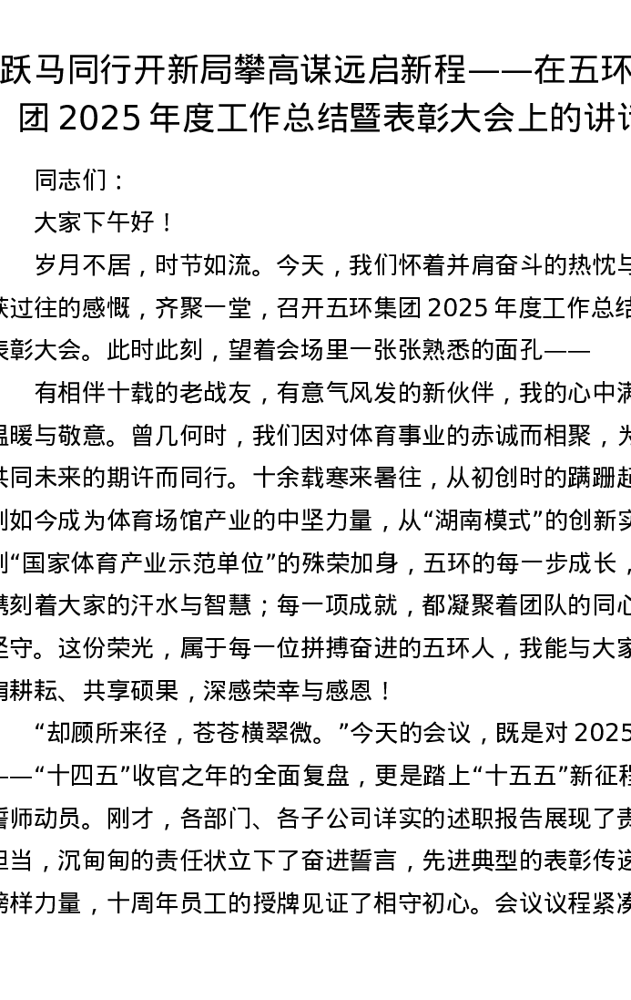 跃马同行开新局 攀高谋远启新程——在五环集团2025年度工作总结暨表彰大会上的讲话