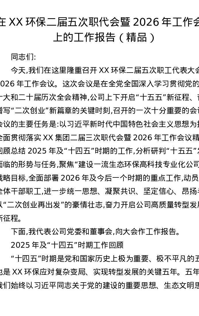 在XX环保二届五次职代会暨2026年工作会议上的工作报告