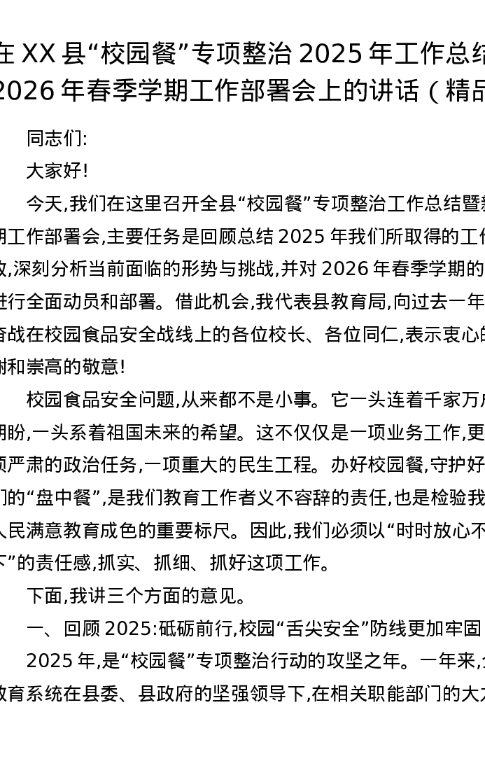 在XX县校园餐专项整治2025年工作总结暨2026年春季学期工作部署会上的讲话