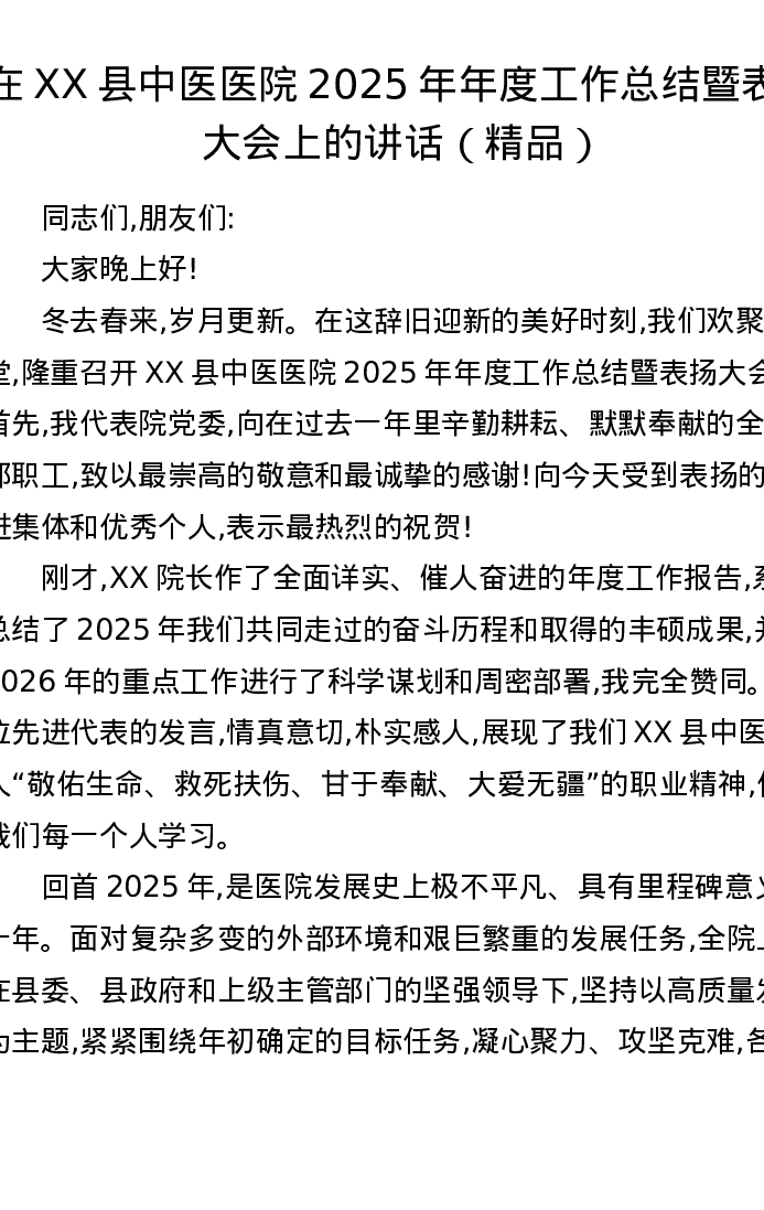 在XX县中医医院2025年年度工作总结暨表扬大会上的讲话