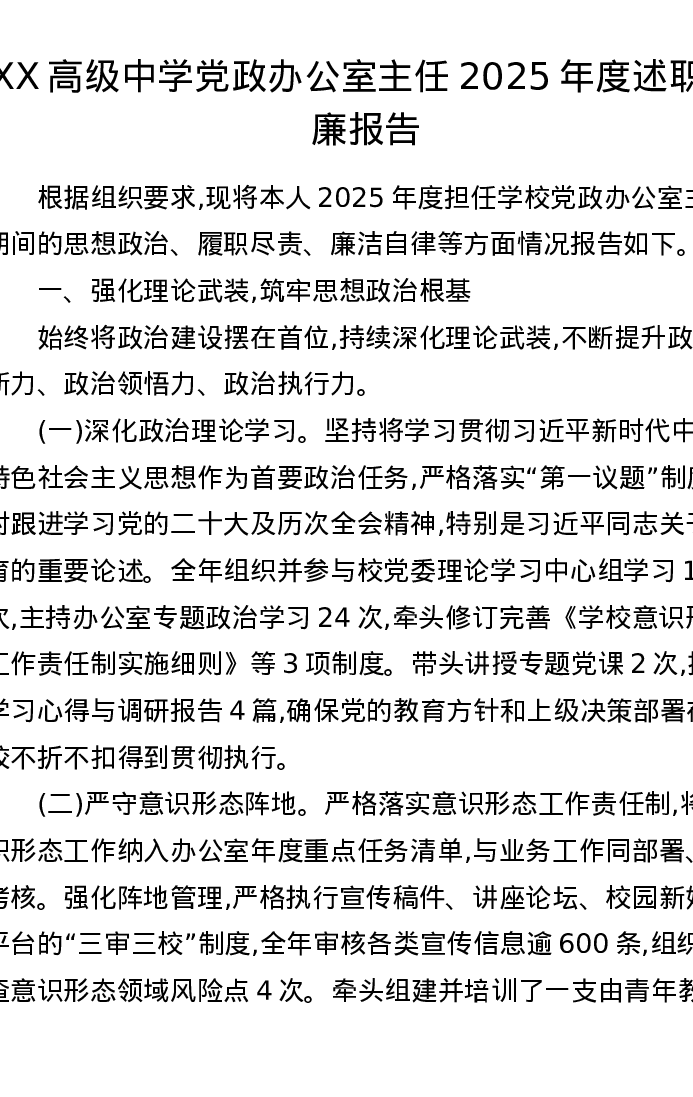 XX高级中学党政办公室主任2025年度述职述廉报告