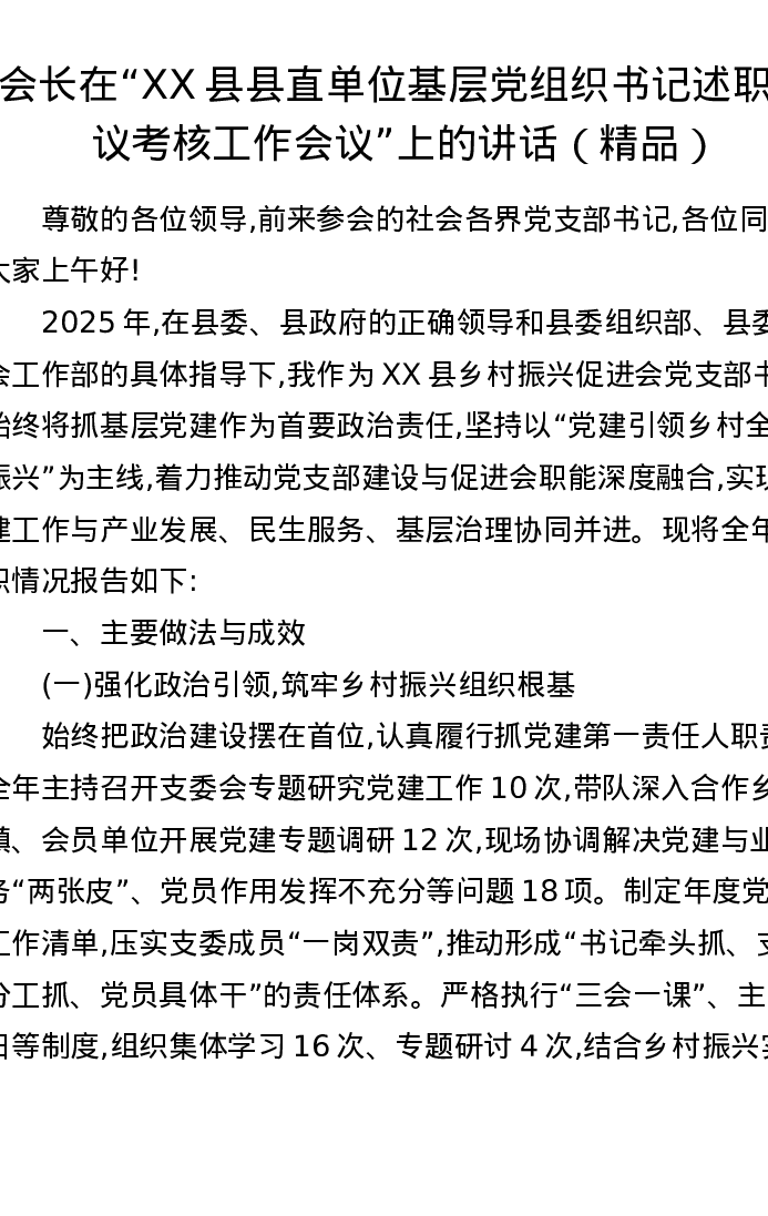 会长在XX县县直单位基层党组织书记述职评议考核工作会议上的讲话