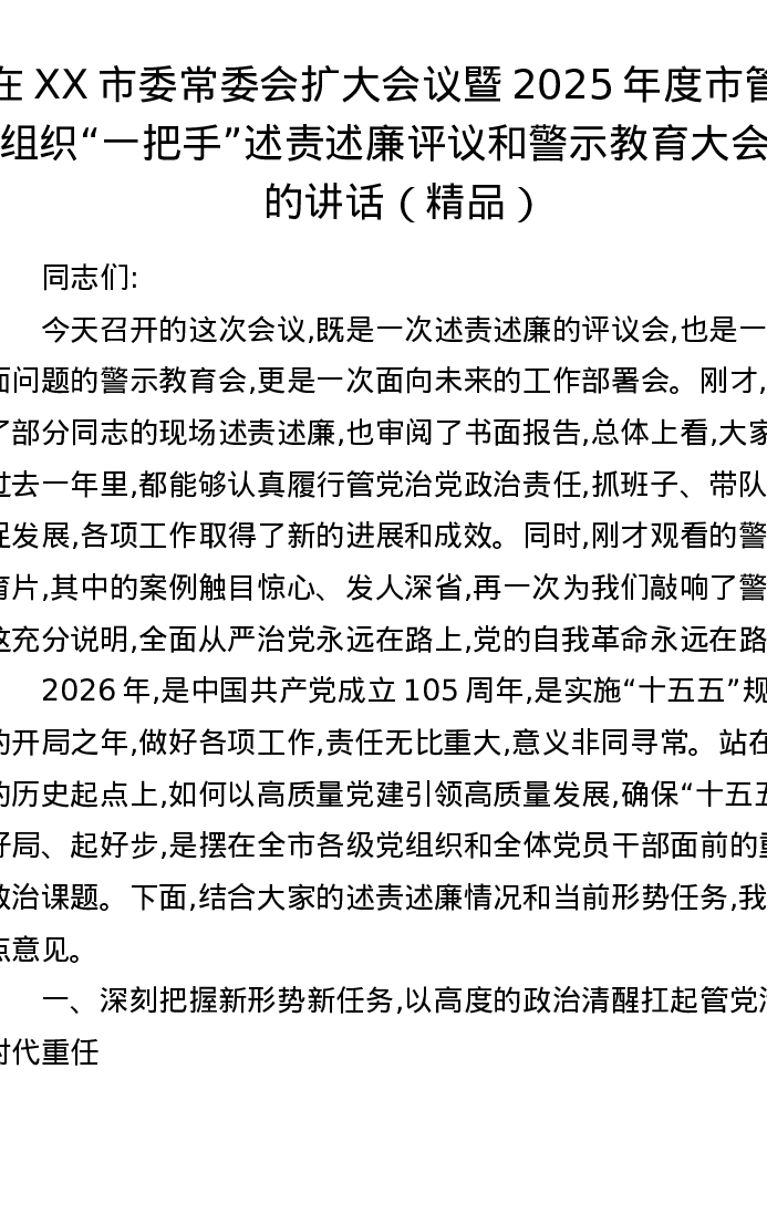 在XX市委常委会扩大会议暨2025年度市管党组织一把手述责述廉评议和警示教育大会上的讲话