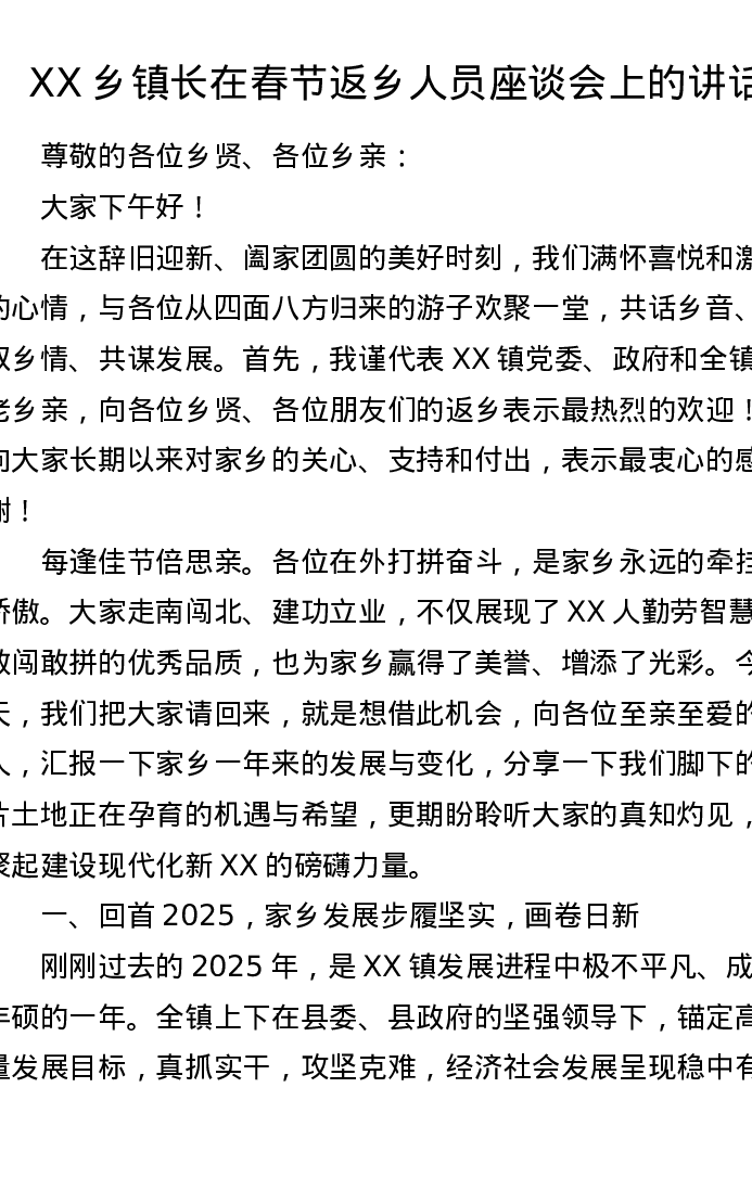 XX乡镇长在春节返乡人员座谈会上的讲话