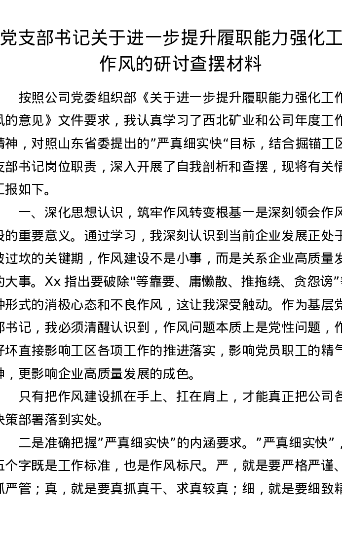 党支部书记关于进一步提升履职能力强化工作作风的研讨查摆材料