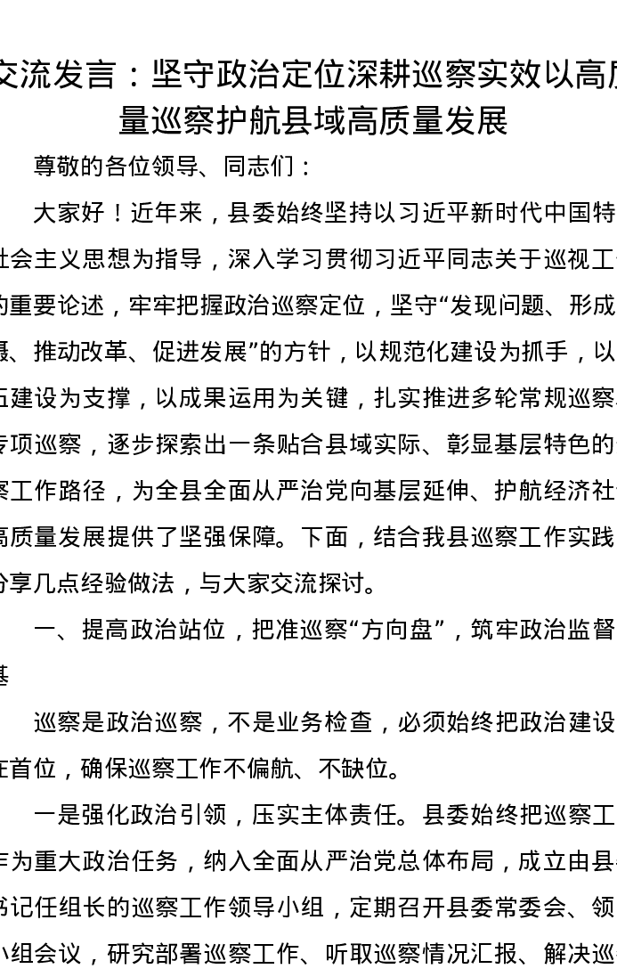 交流发言:坚守政治定位 深耕巡察实效 以高质量巡察护航县域高质量发展