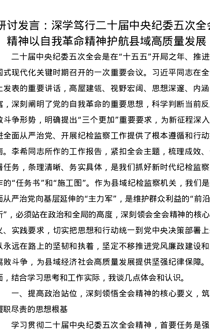 研讨发言:深学笃行二十届中央纪委五次全会精神以自我革命精神护航县域高质量发展