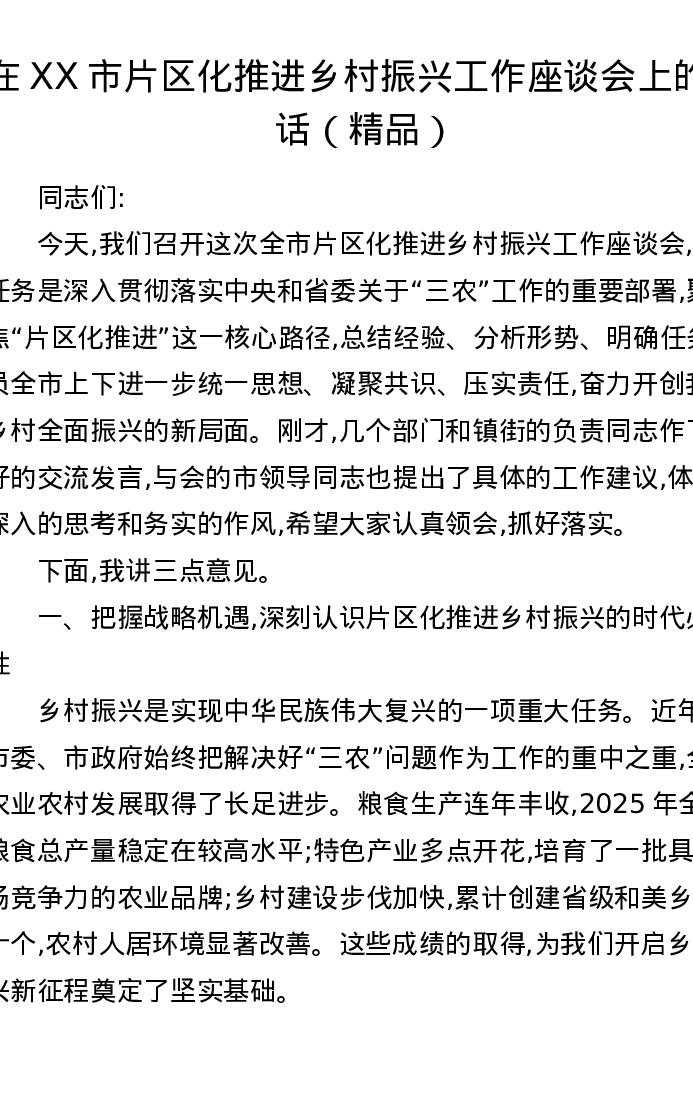 在XX市片区化推进乡村振兴工作座谈会上的讲话