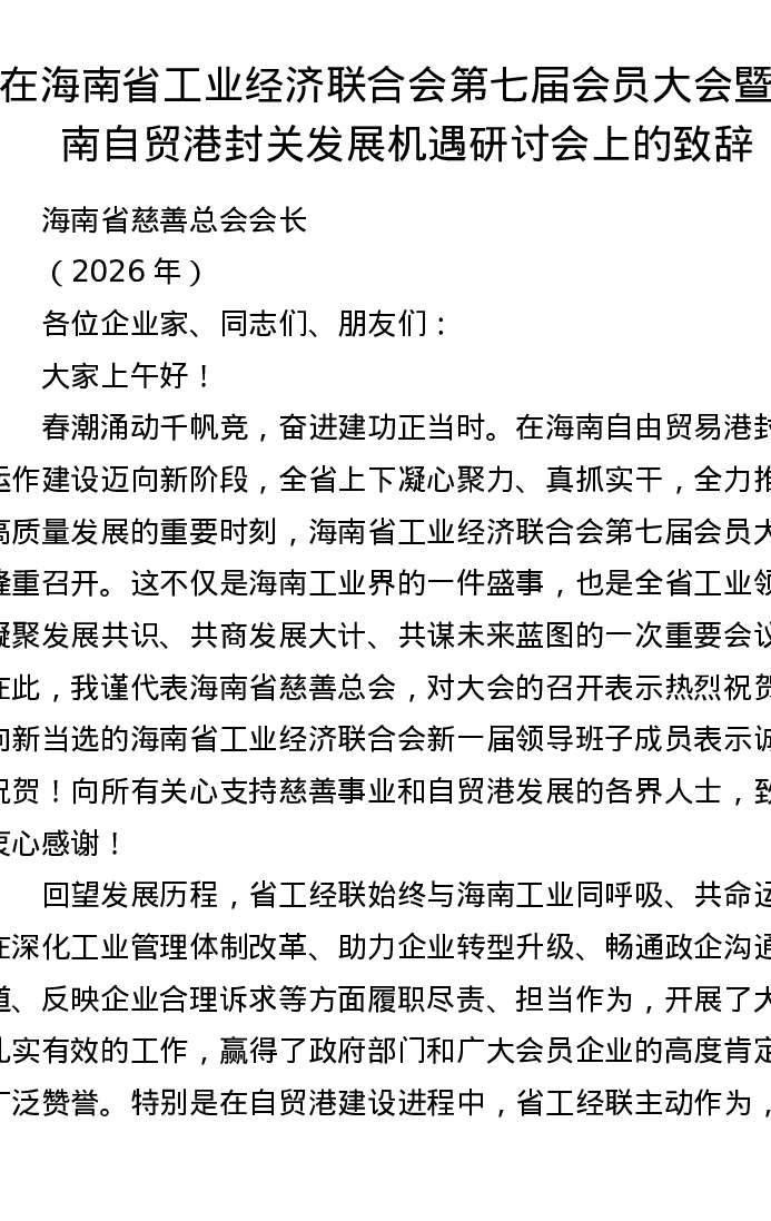 在海南省工业经济联合会第七届会员大会暨海南自贸港封关发展机遇研讨会上的致辞
