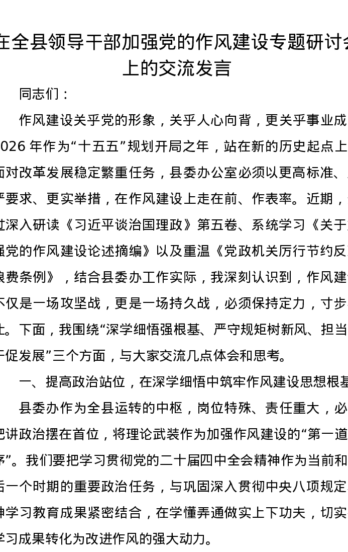 在全县领导干部加强党的作风建设专题研讨会上的交流发言