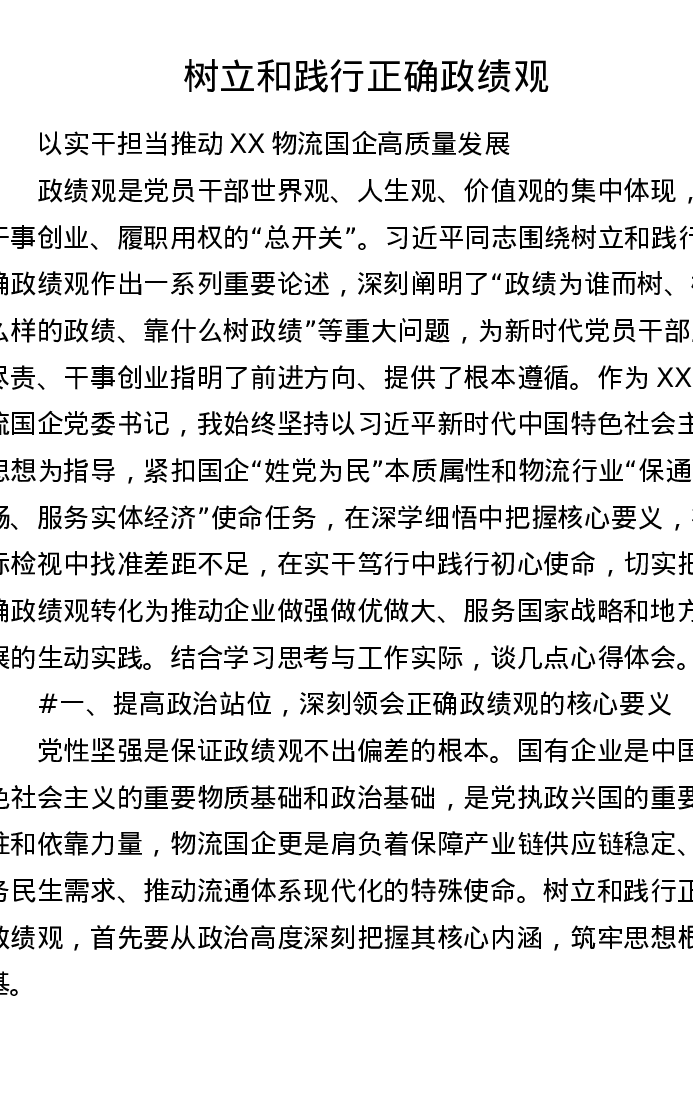 XX物流国企党委书记关于树立和践行正确ZJG的心得体会(4315字)