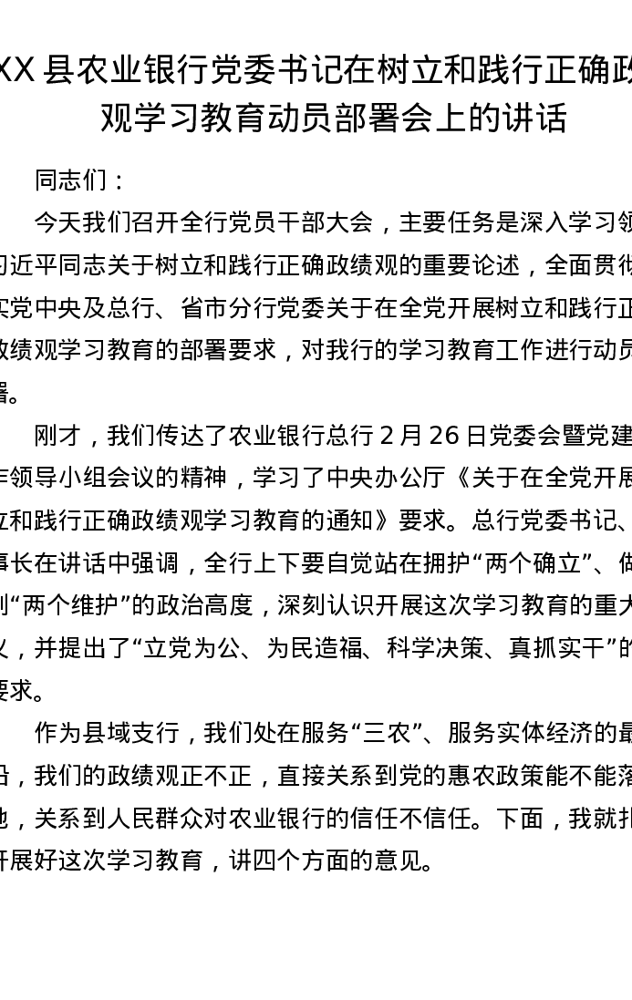 XX县农业银行党委书记在树立和践行正确ZJG学习教育动员部署会上的讲话(4871字)