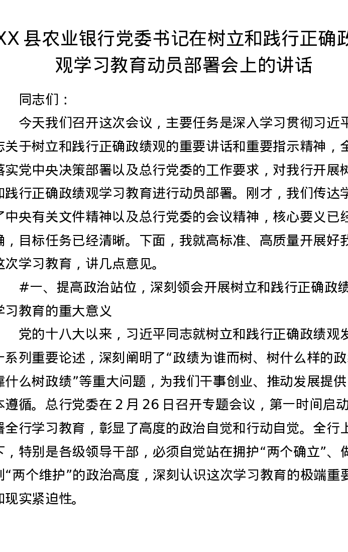 XX县农业银行党委书记在树立和践行正确ZJG学习教育动员部署会上的讲话(6278字)