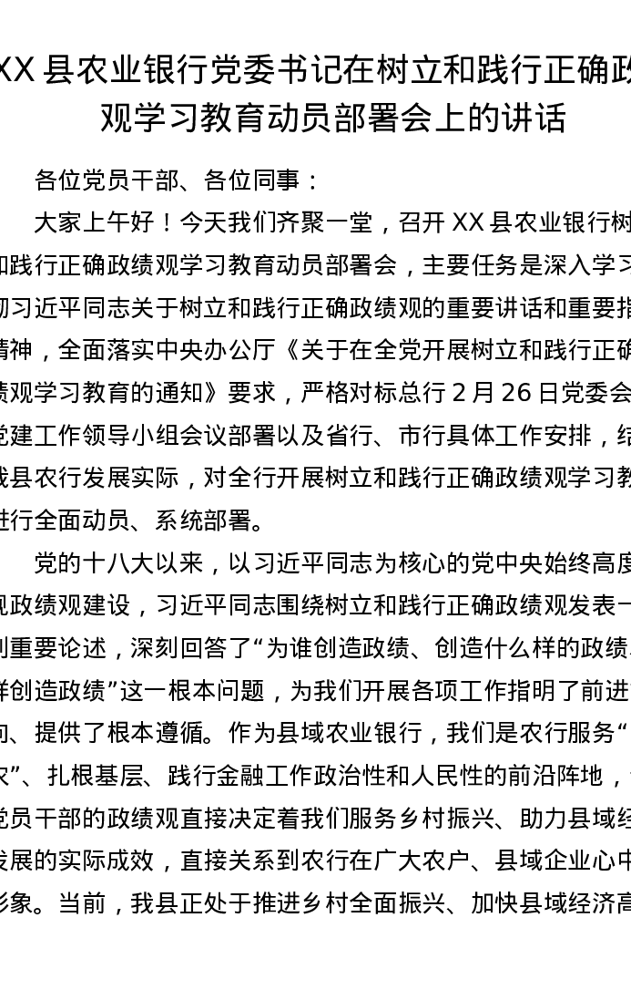 XX县农业银行党委书记在树立和践行正确ZJG学习教育动员部署会上的讲话(9001字)