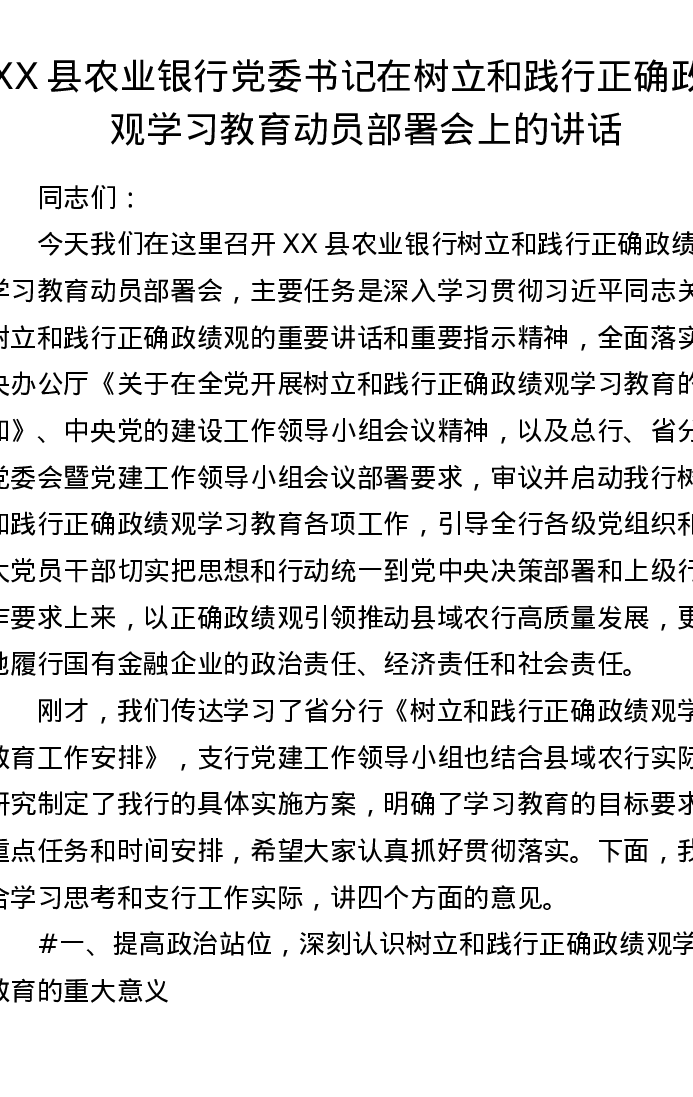 XX县农业银行党委书记在树立和践行正确ZJG学习教育动员部署会上的讲话(9745字)