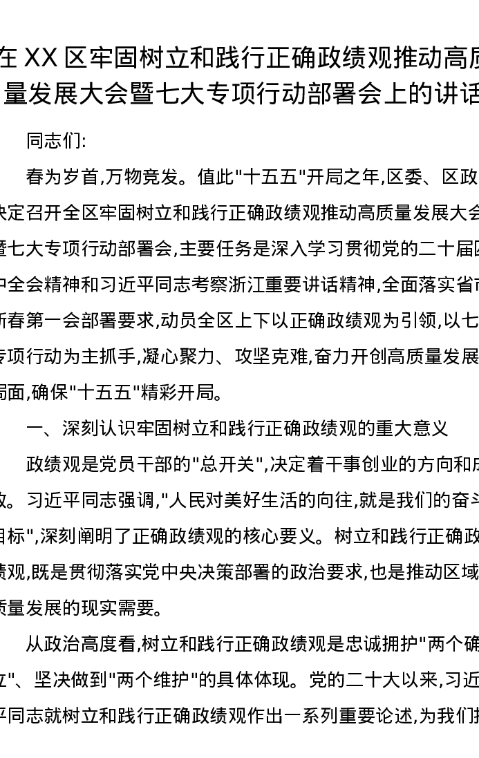 在XX区牢固树立和践行正确ZJG推动高质量发展大会暨七大专项行动部署会上的讲话