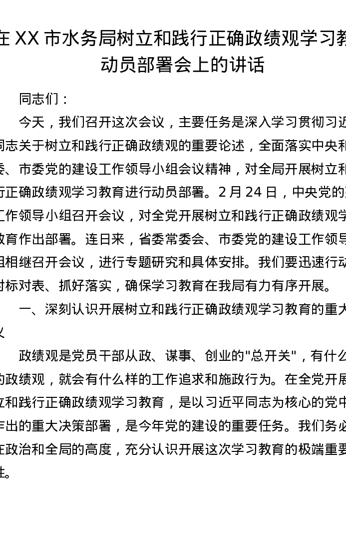 在XX市水务局树立和践行正确ZJG学习教育动员部署会上的讲话