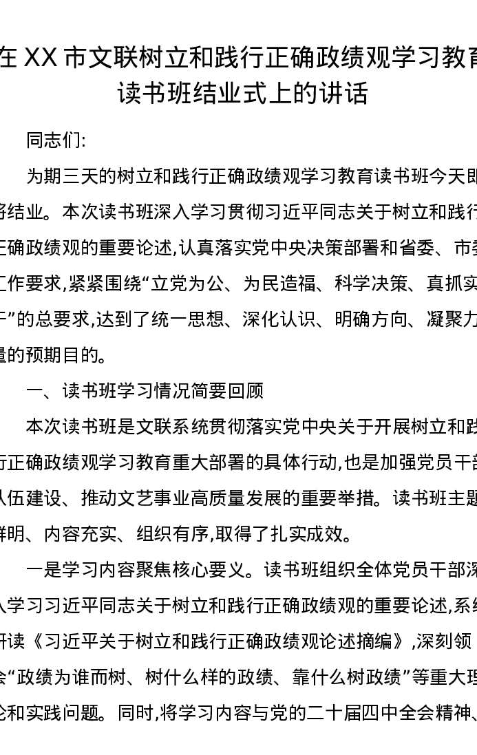在XX市文联树立和践行正确ZJG学习教育读书班结业式上的讲话