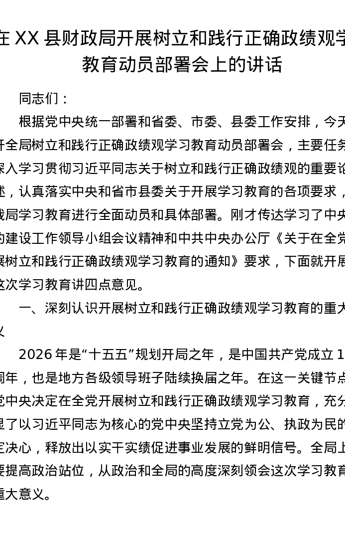 在XX县财政局开展树立和践行正确ZJG学习教育动员部署会上的讲话