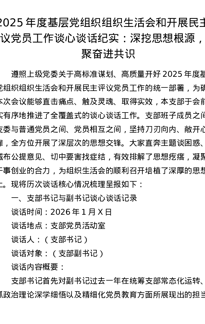 2025年度基层党组织组织xxx和开展民主评议党员工作谈心谈话纪实:深挖思想根源,凝聚奋进共识