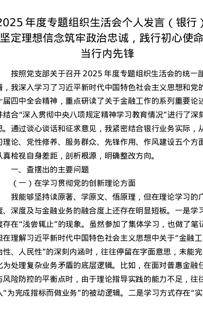 2025年度专题组织xxx个人发言(银行):坚定理想信念筑牢政治忠诚,践行初心使命争当行内先锋