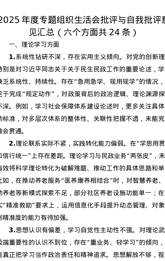 2025年度专题组织xxx批评与自我批评意见汇总(六个方面共24条)