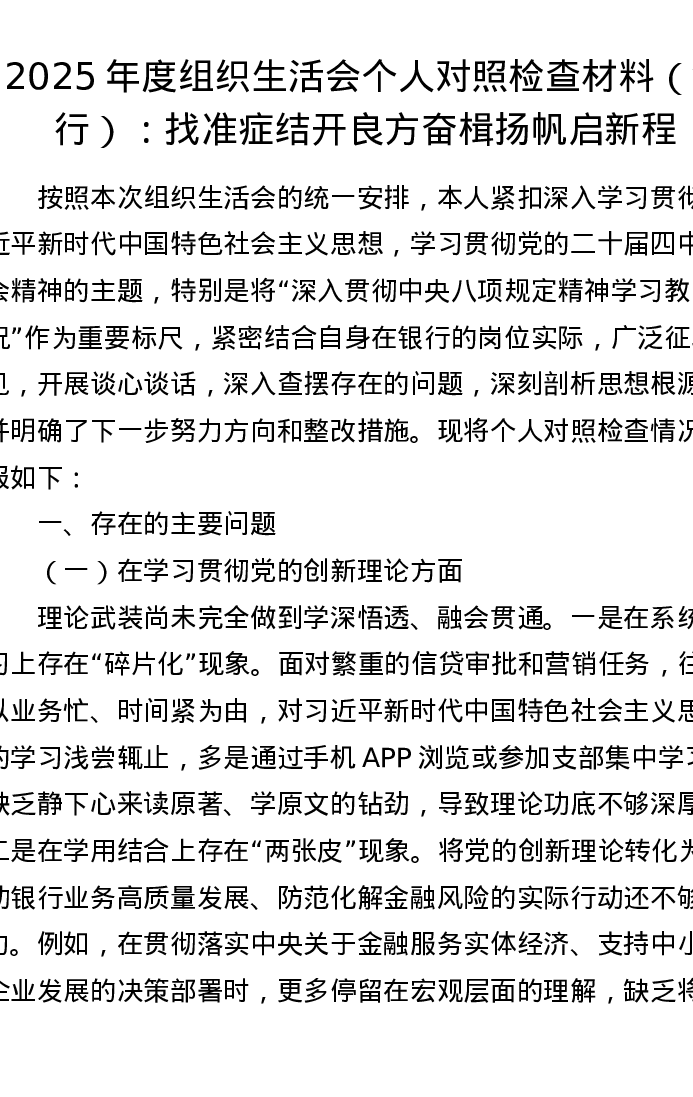 2025年度组织xxx个人对照检查材料(银行):找准症结开良方 奋楫扬帆启新程
