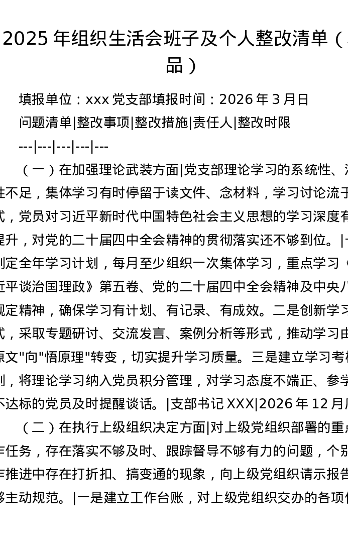 2025年组织xxx班子及个人整改清单