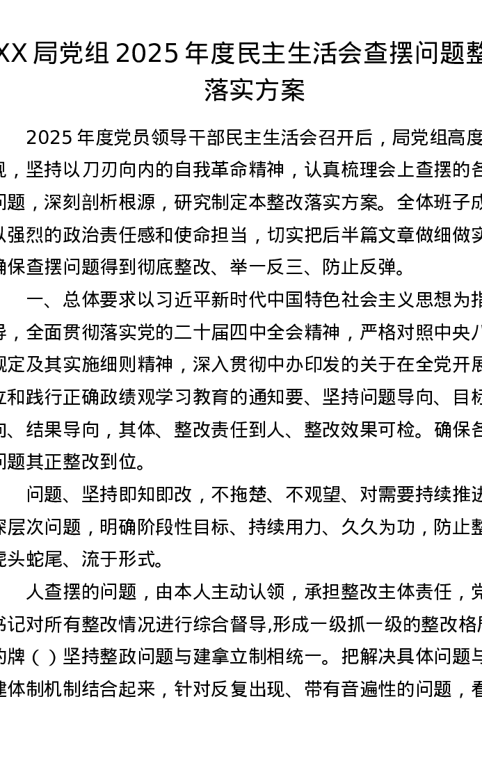 XX局党组2025年度xxxxx查摆问题整改落实方案
