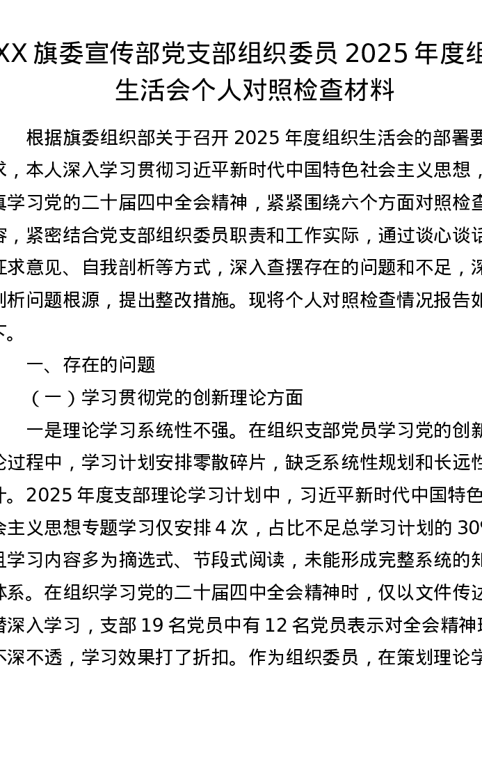 XX旗委宣传部党支部组织委员2025年度组织xxx个人对照检查材料
