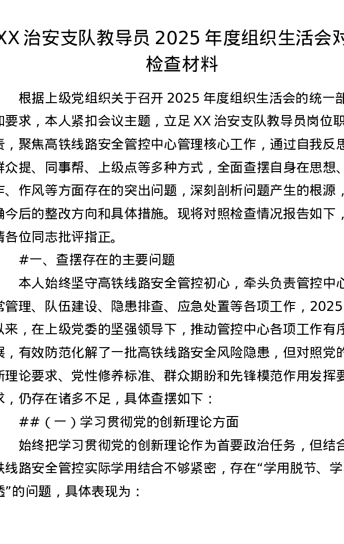 XX治安支队教导员2025年度组织xxx对照检查材料(8672字)