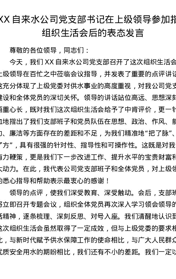 XX自来水公司党支部书记在上级领导参加指导组织xxx后的表态发言