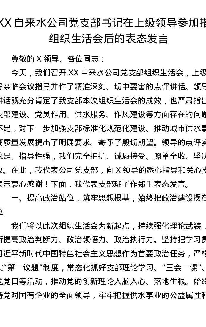 XX自来水公司党支部书记在上级领导参加指导组织xxx后的表态发言3