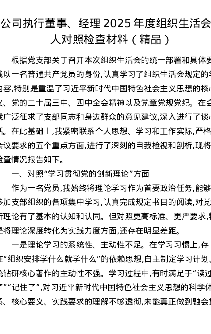 公司执行董事、经理2025年度组织xxx个人对照检查材料