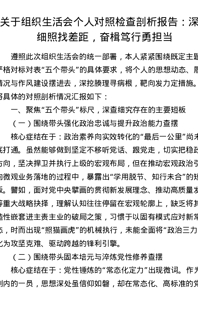 关于组织xxx个人对照检查剖析报告:深查细照找差距,奋楫笃行勇担当