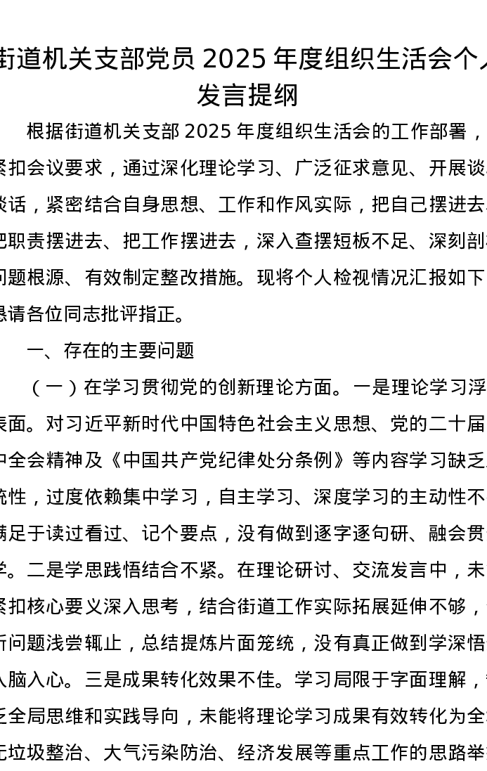 街道机关支部党员2025年度组织xxx个人发言提纲