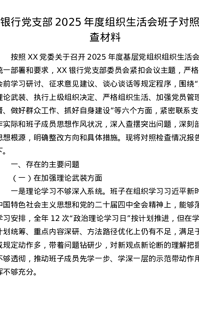 银行党支部2025年度组织xxx班子对照检查材料