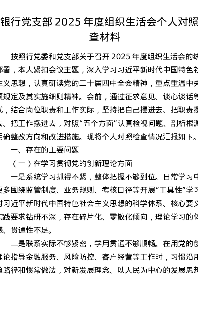 银行党支部2025年度组织xxx个人对照检查材料