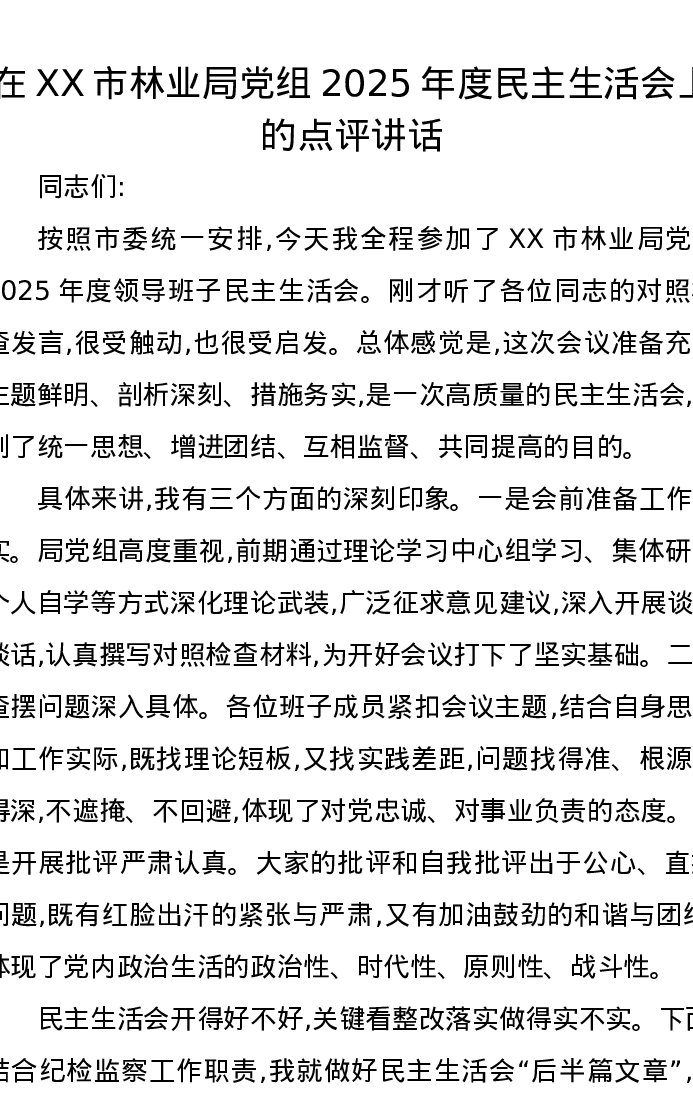 在XX市林业局党组2025年度xxxxx上的点评讲话