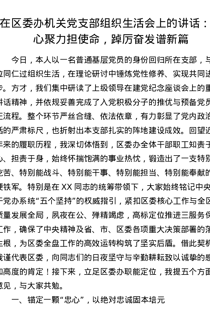 在区委办机关党支部组织xxx上的讲话:凝心聚力担使命,踔厉奋发谱新篇