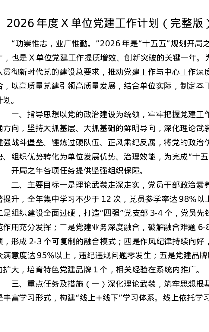 2026年度X单位党建工作计划
