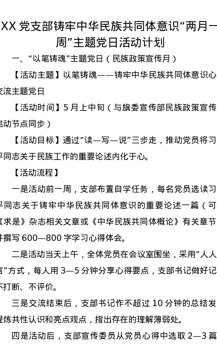 XX党支部铸牢中华民族共同体意识两月一周主题党日活动计划
