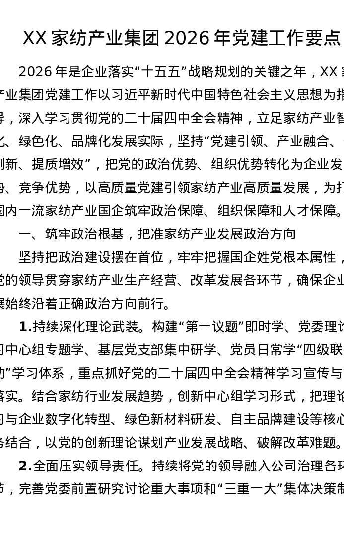 XX家纺产业集团2026年党建工作要点