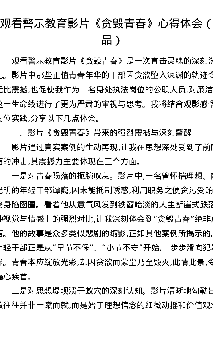 观看警示教育影片《贪毁青春》心得体会