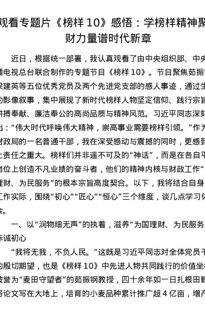 观看专题片《榜样10》感悟:学榜样精神聚理财力量谱时代新章