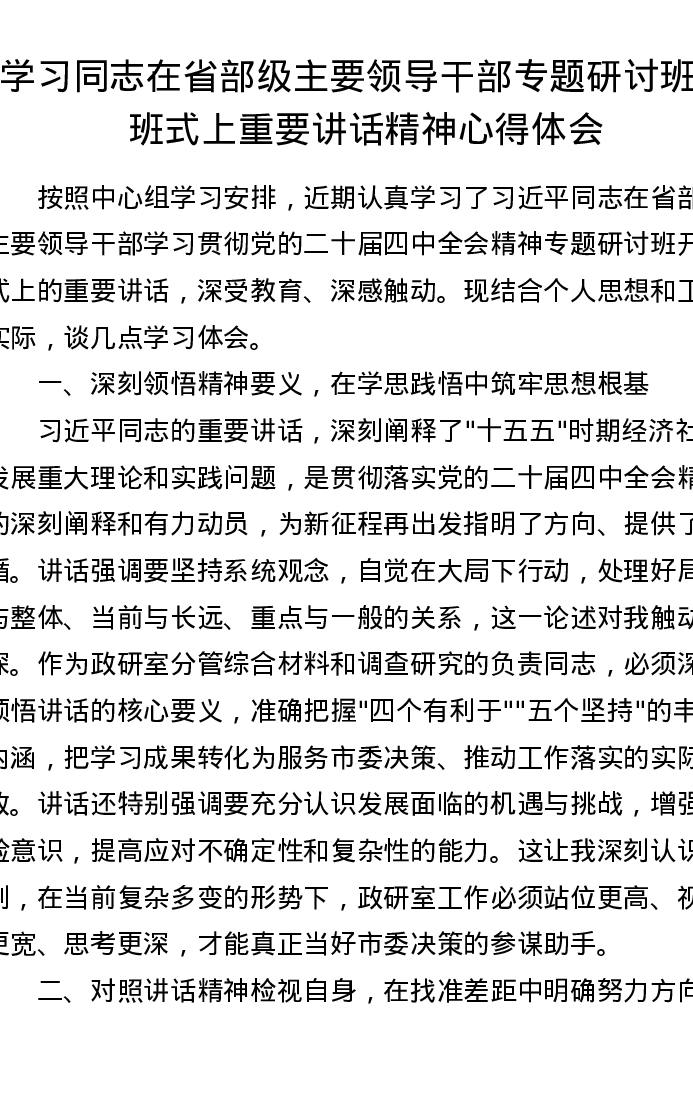 学习总书记在省部级主要领导干部专题研讨班开班式上重要讲话精神心得体会