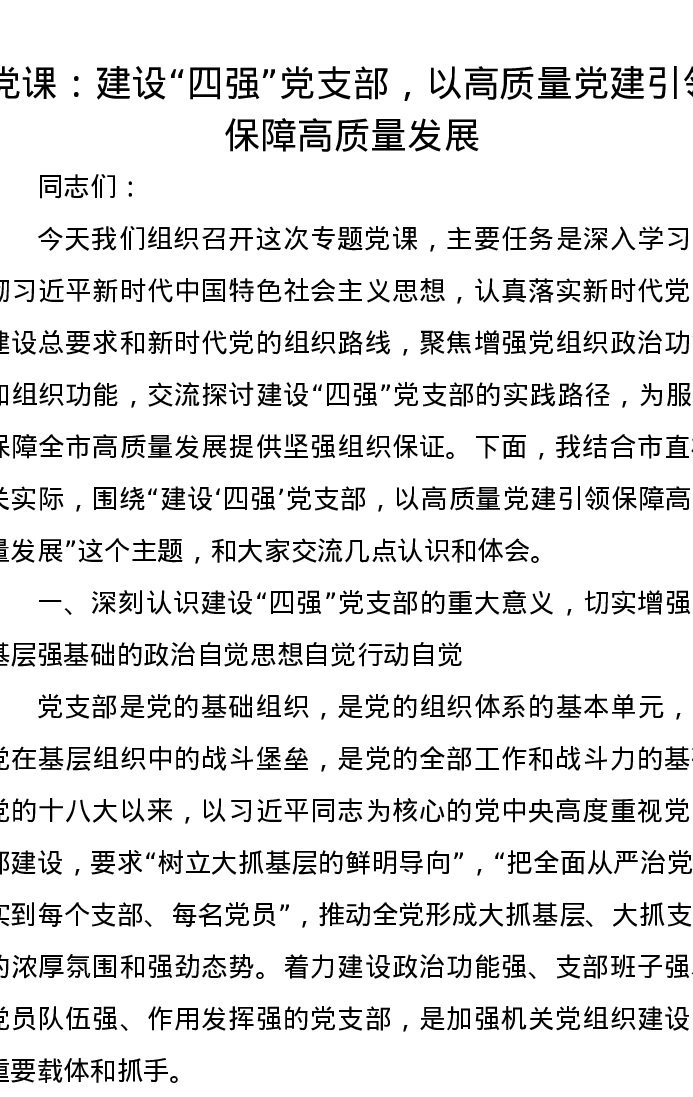 党课:建设四强党支部,以高质量党建引领保障高质量发展