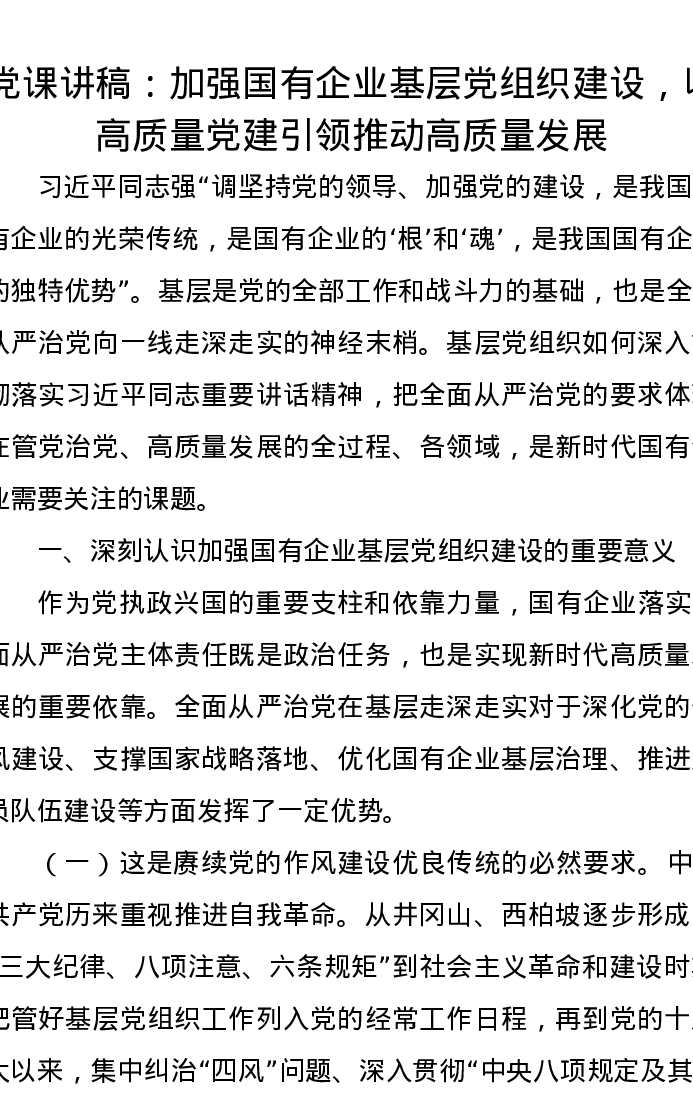 党课讲稿:加强国有企业基层党组织建设,以高质量党建引领推动高质量发展