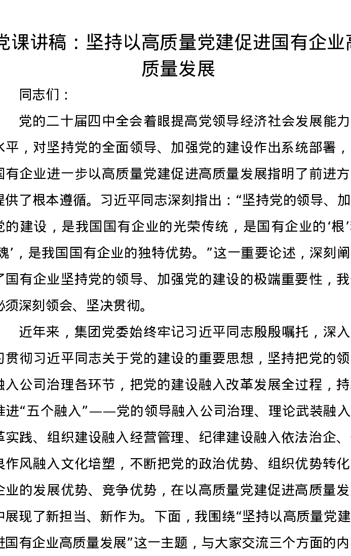 党课讲稿:坚持以高质量党建促进国有企业高质量发展