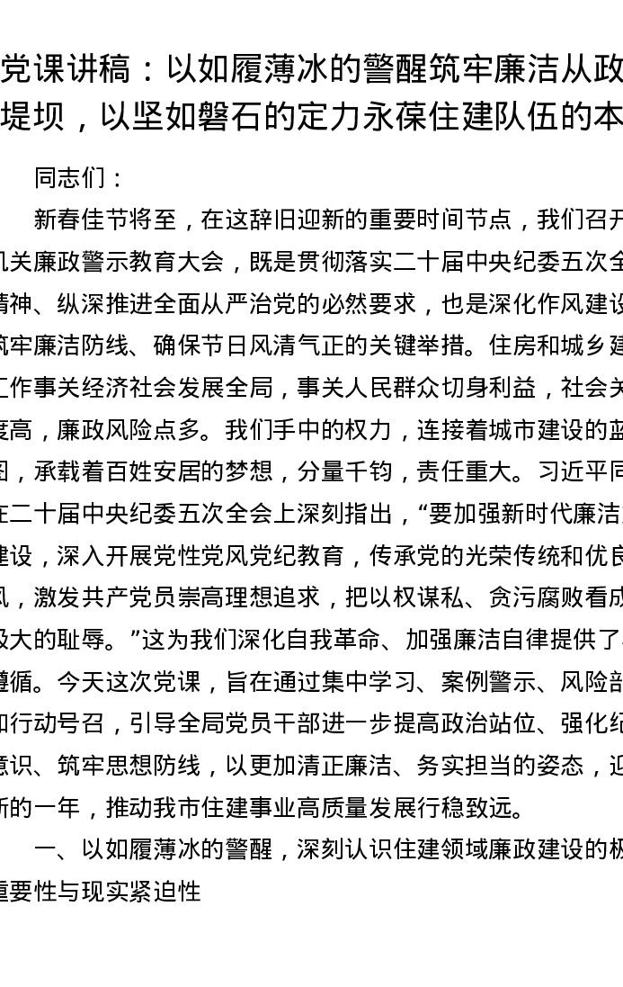 党课讲稿:以如履薄冰的警醒筑牢廉洁从政的堤坝,以坚如磐石的定力永葆住建队伍的本色